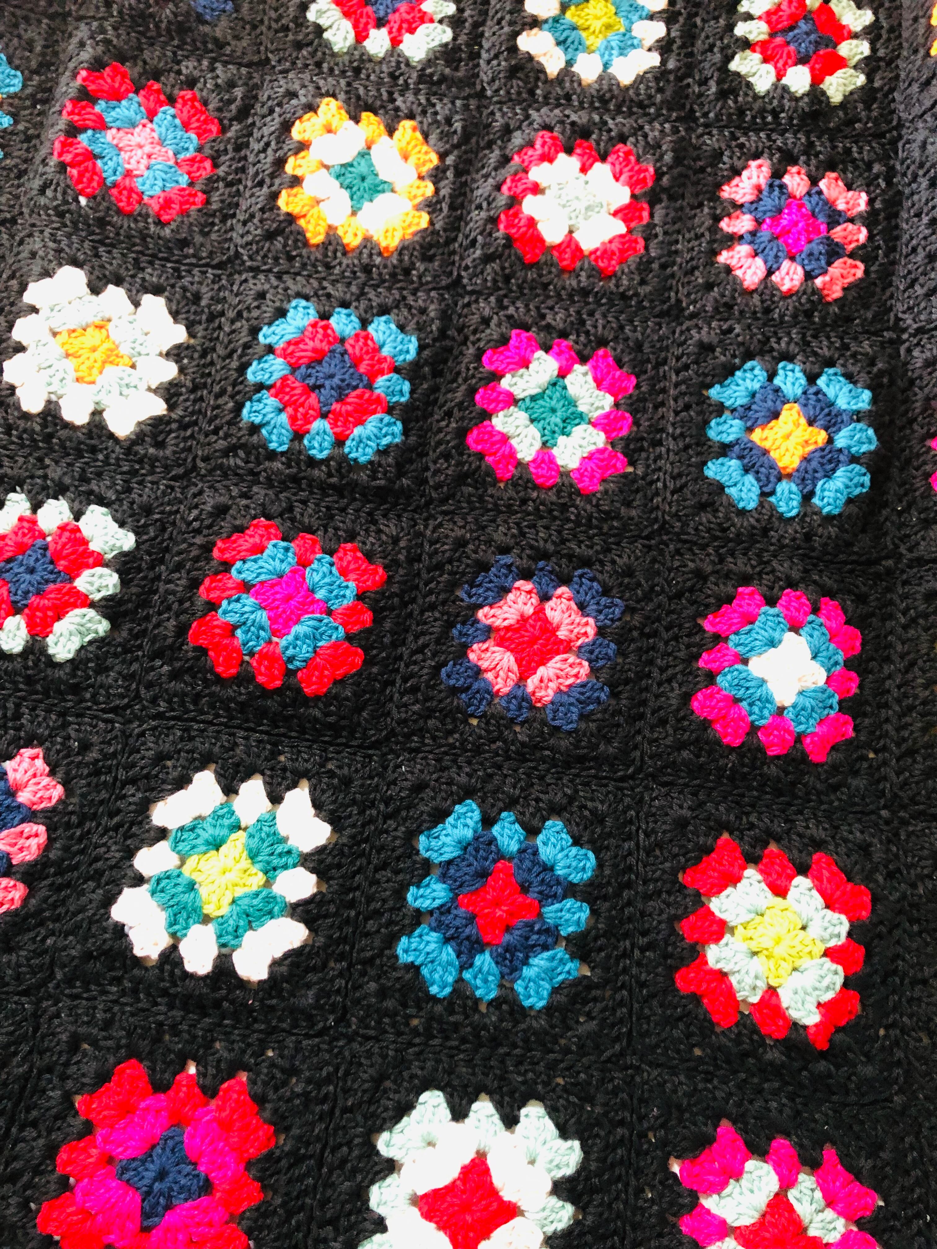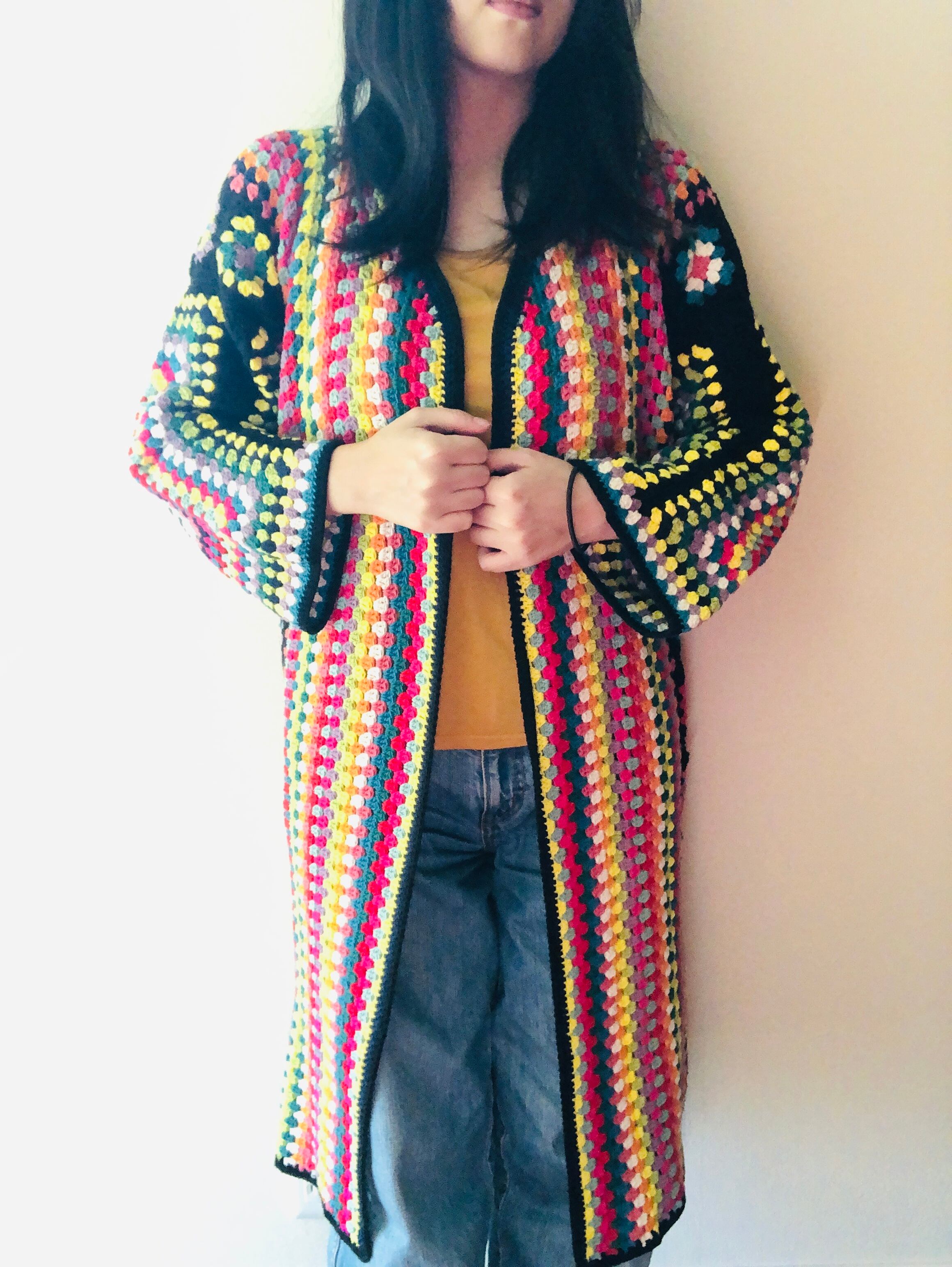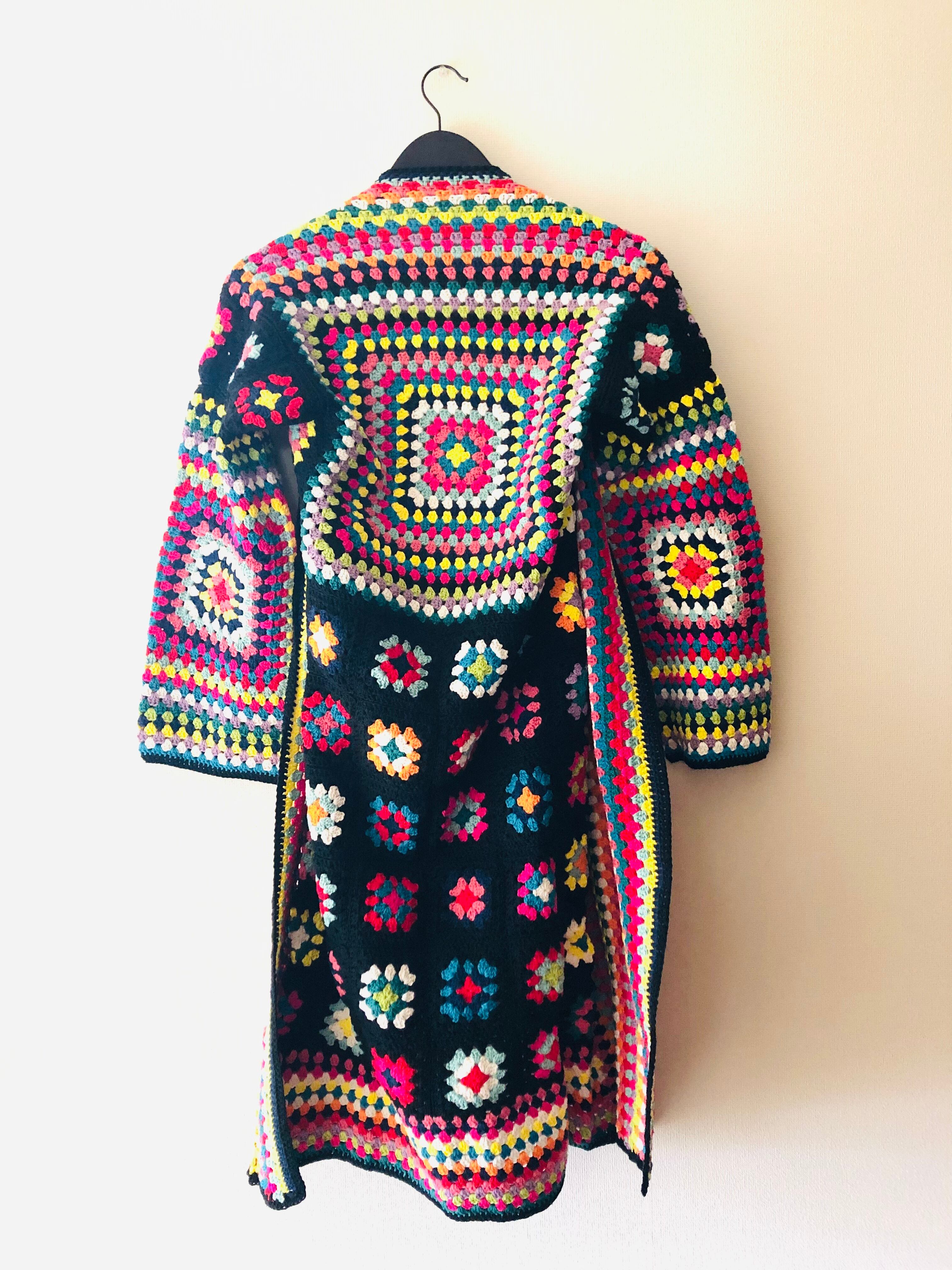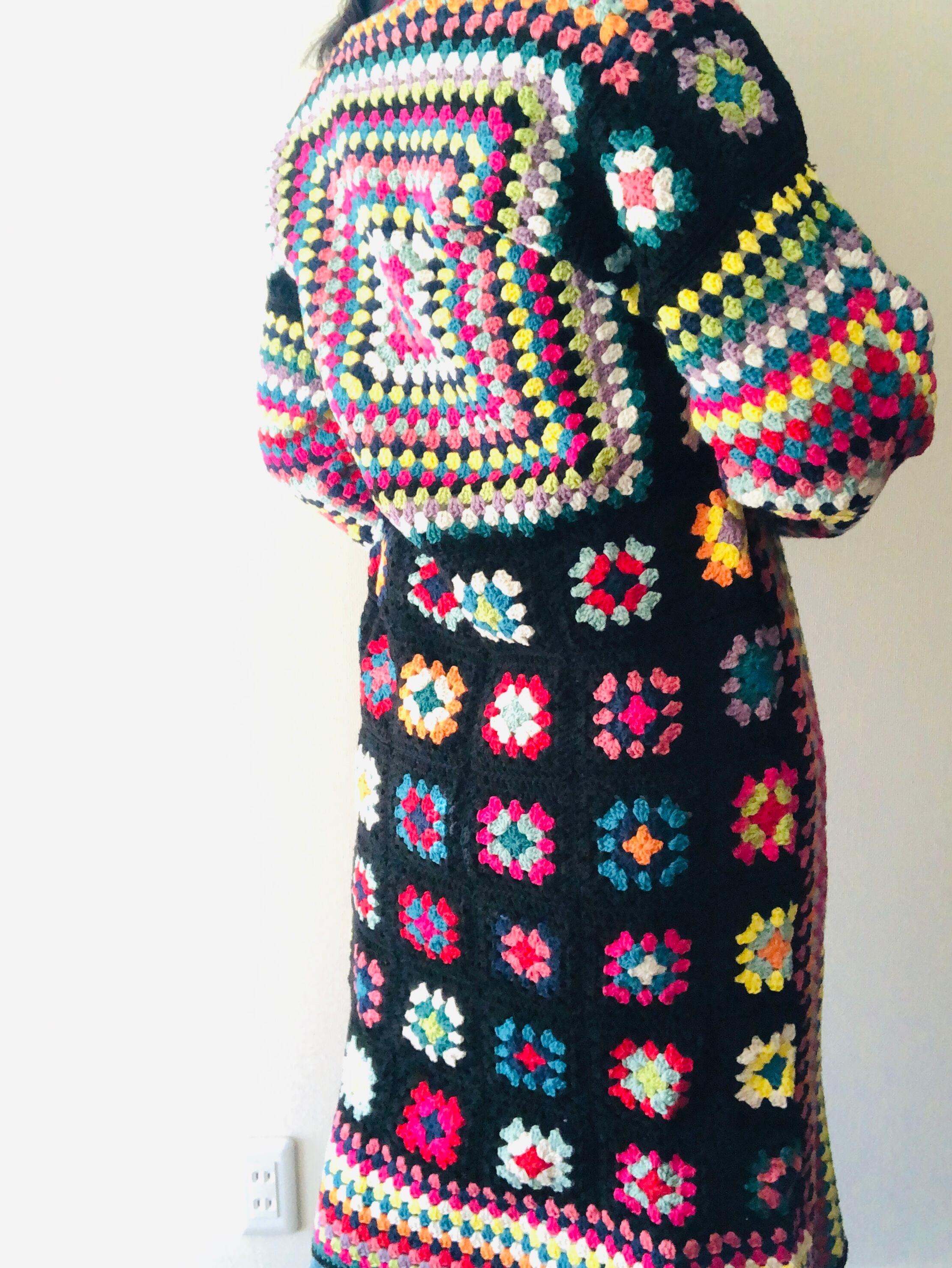 裾に向かって並ぶ黒ベースのカラフルな小さなグラニースクエアも可愛い。