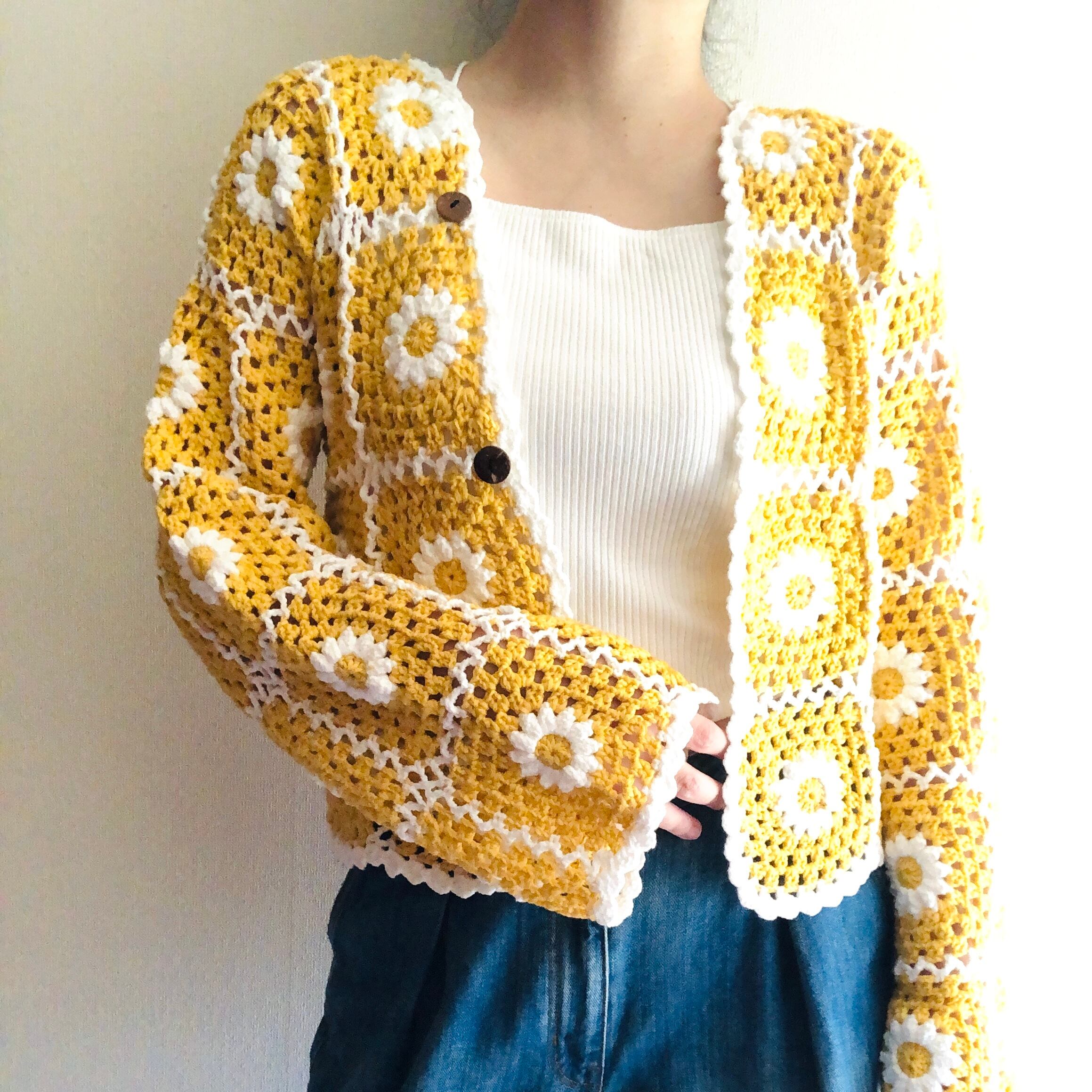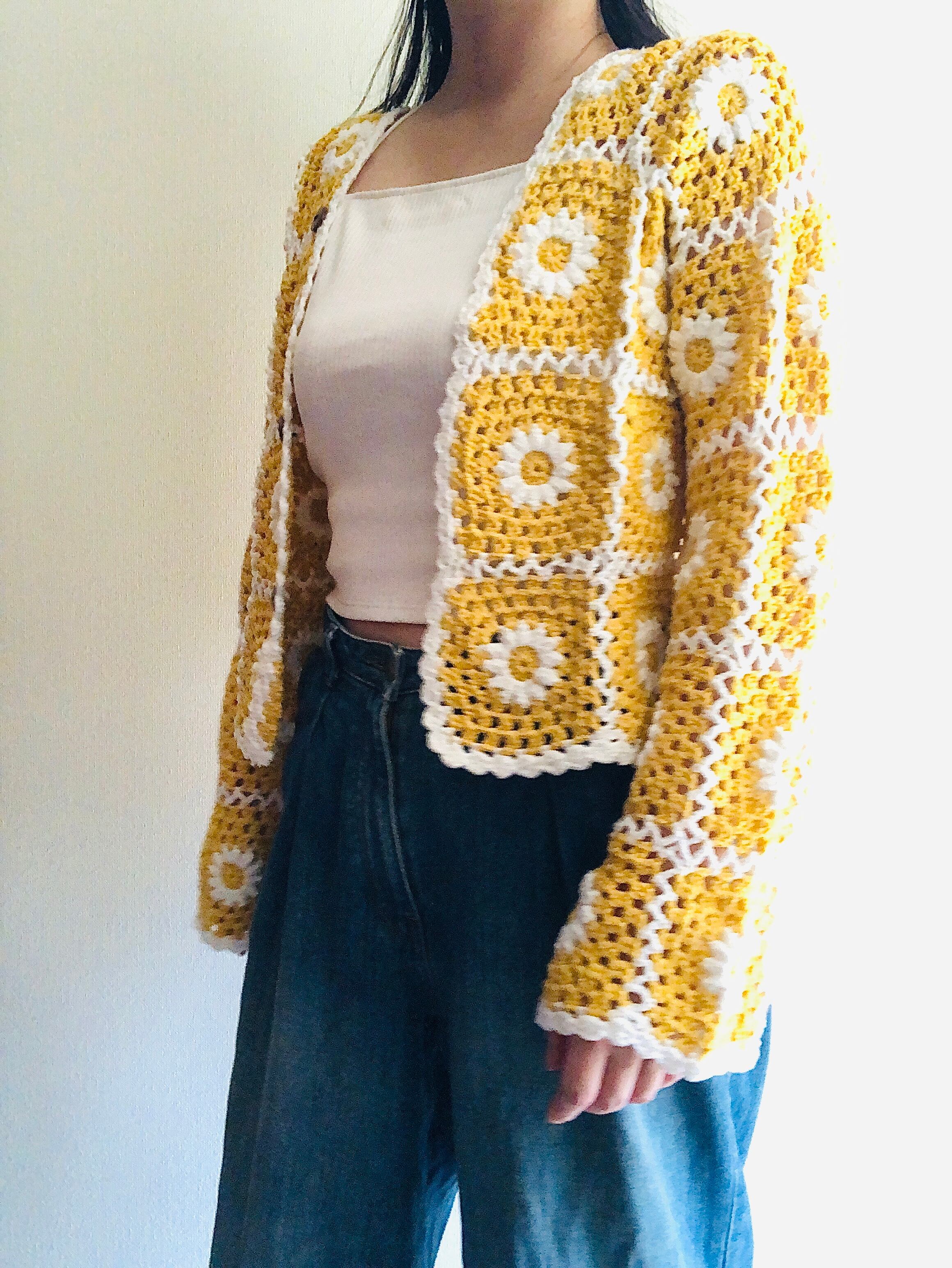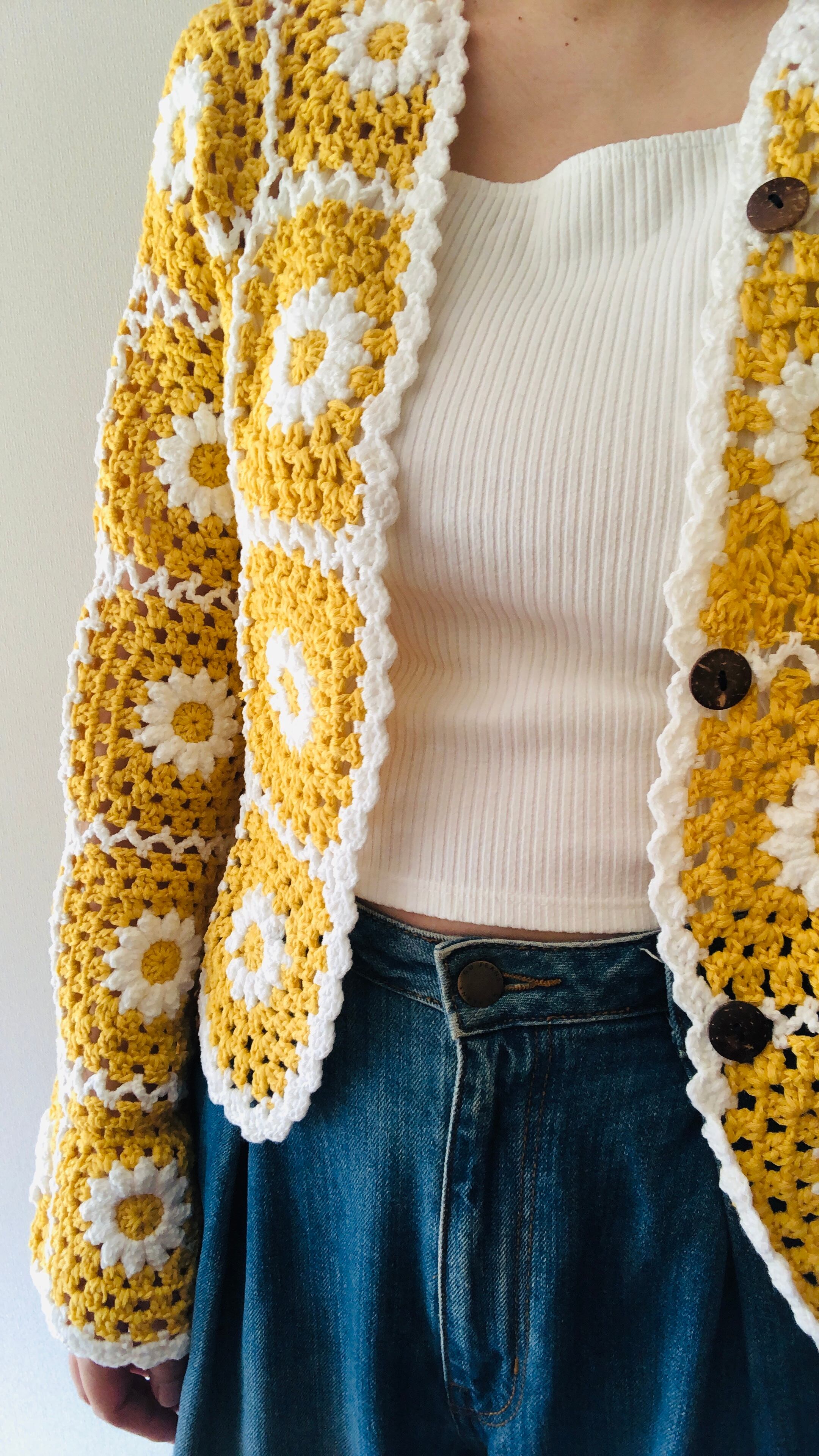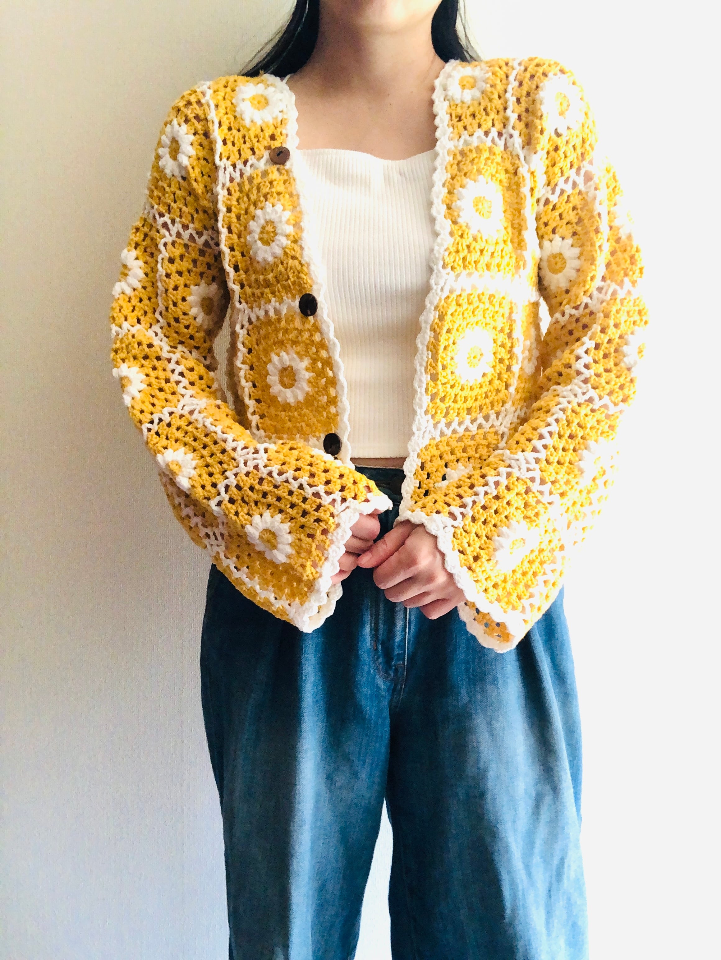 黄色いミモザのような色合いが可愛らしい、グラニースクエア編みのカーディガンです。