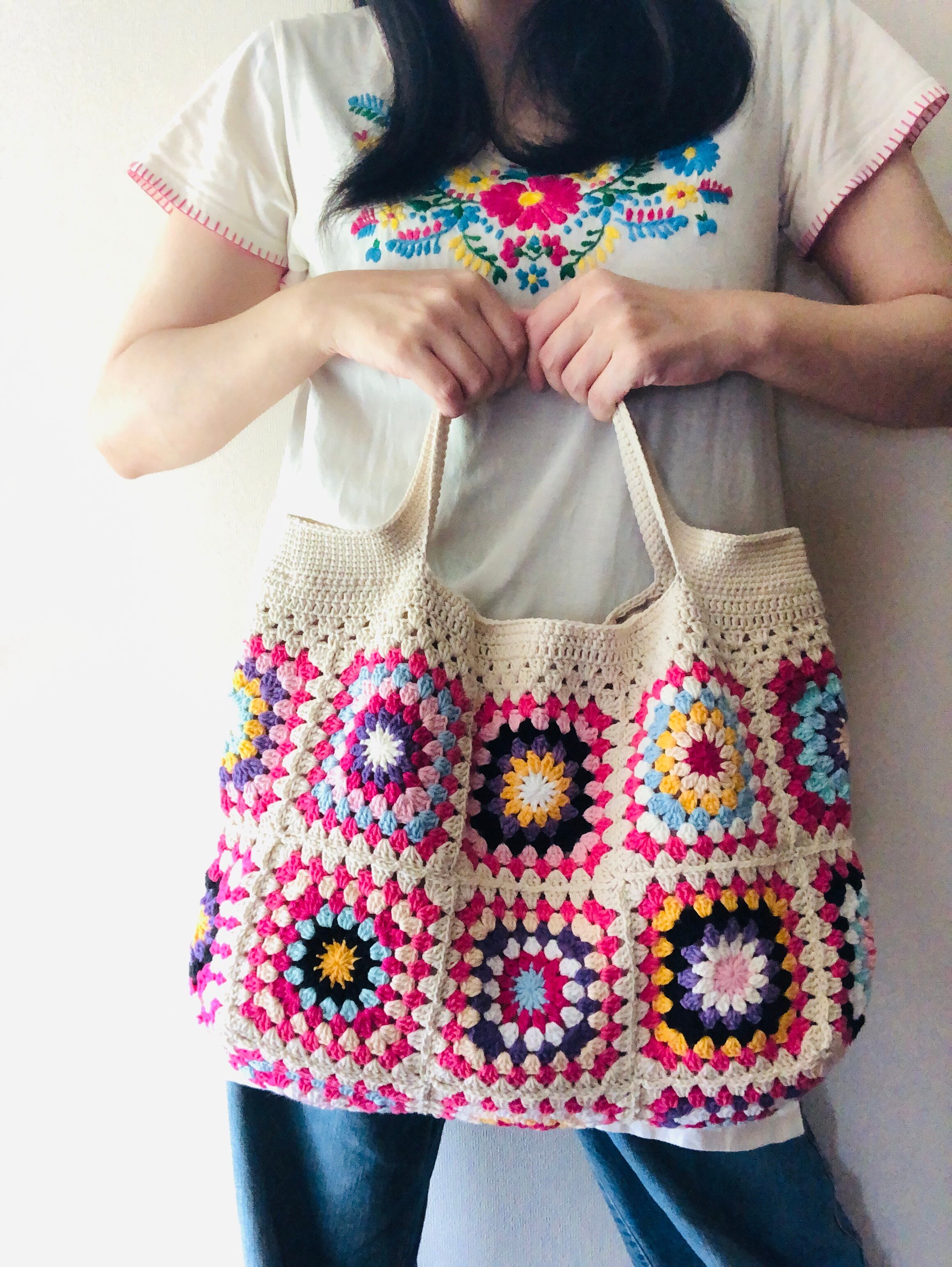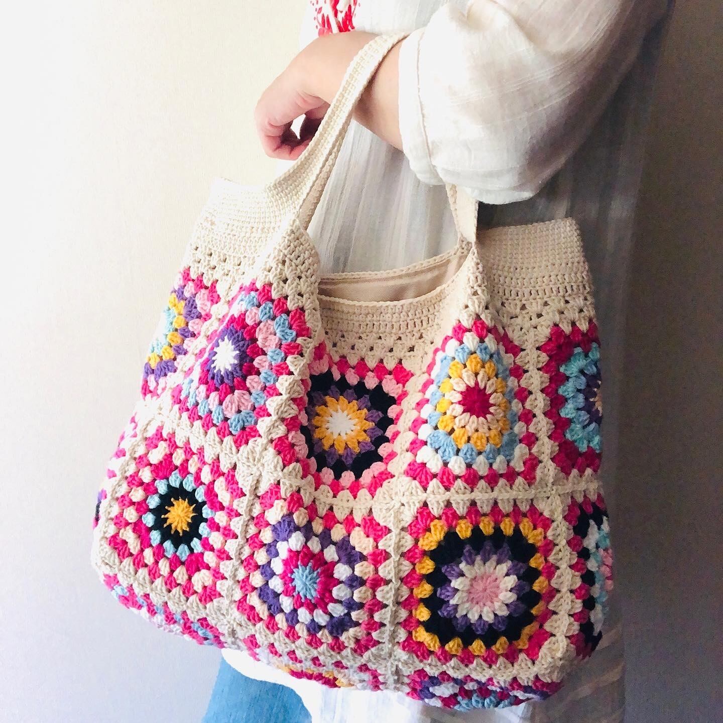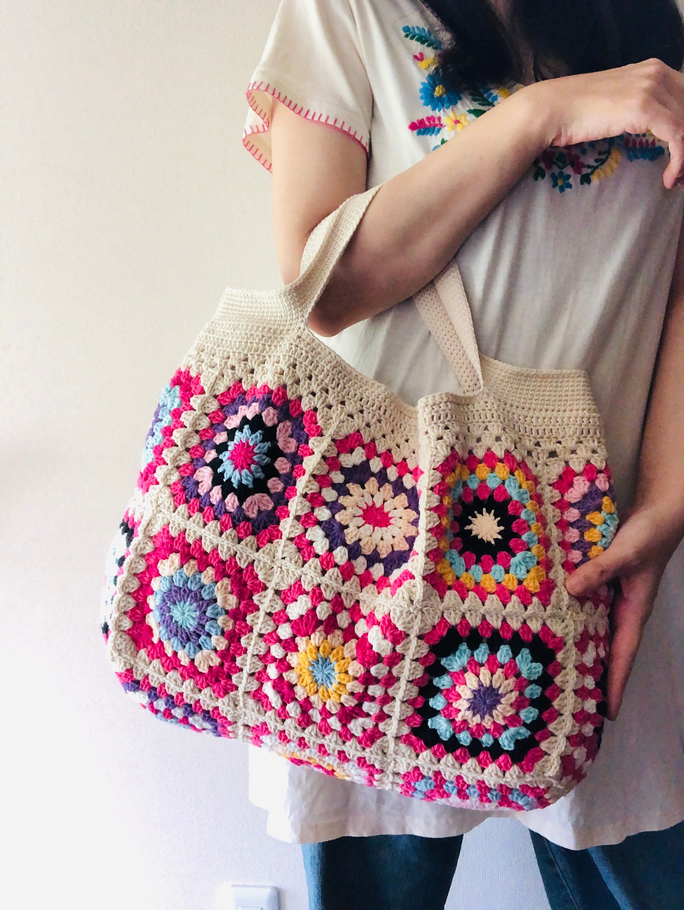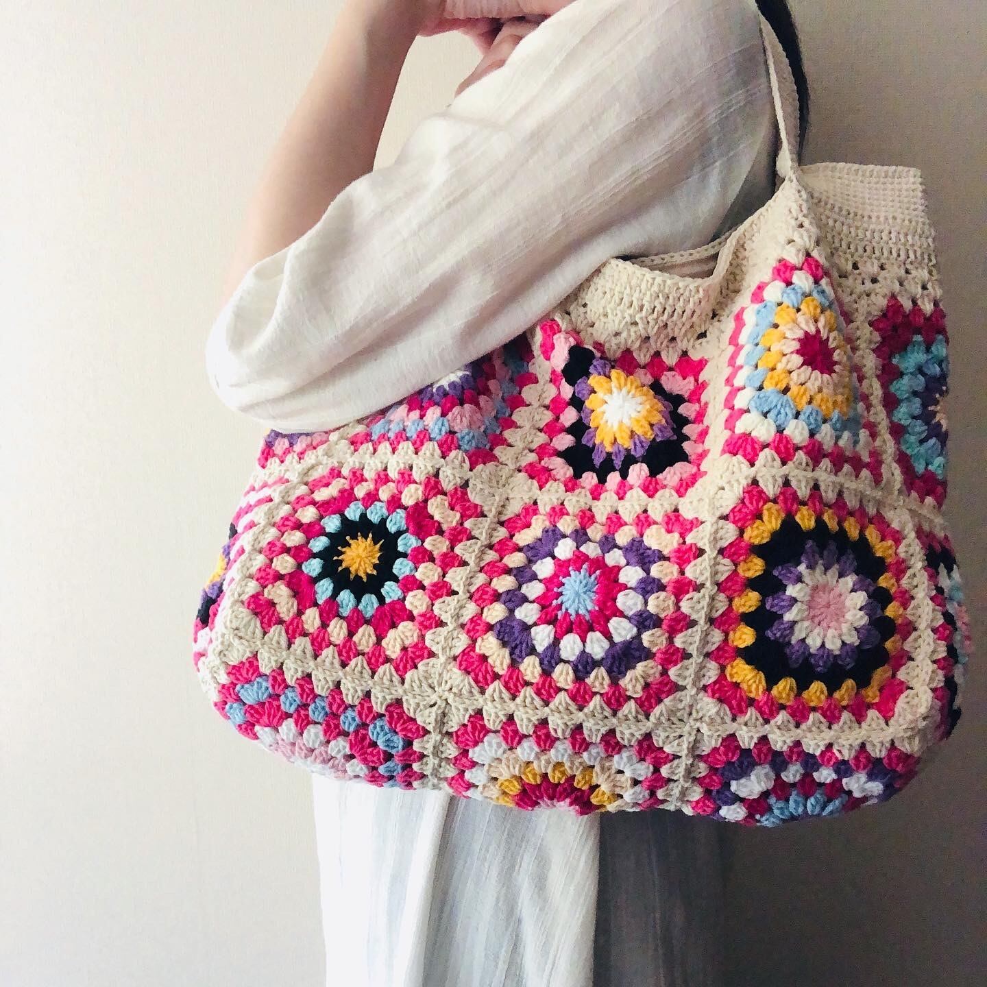 グラニースクエアの編み方は、ひとつひとつ異なるのが魅力です。どの部分にどの色を組み合わせるか、一つ一つ考え制作しています。大切に使っていくうちに、より愛おしくなっていくことうけあいです。