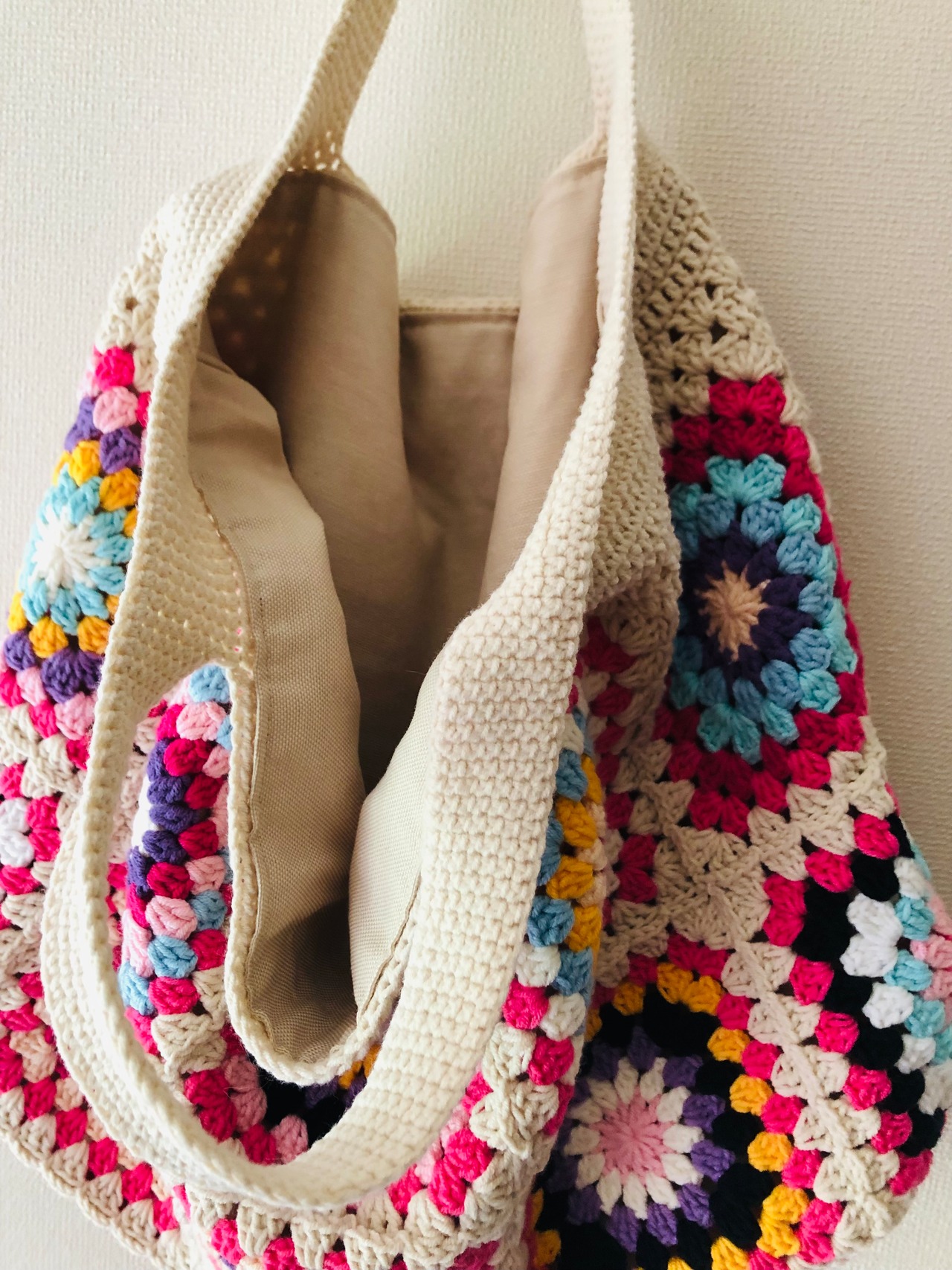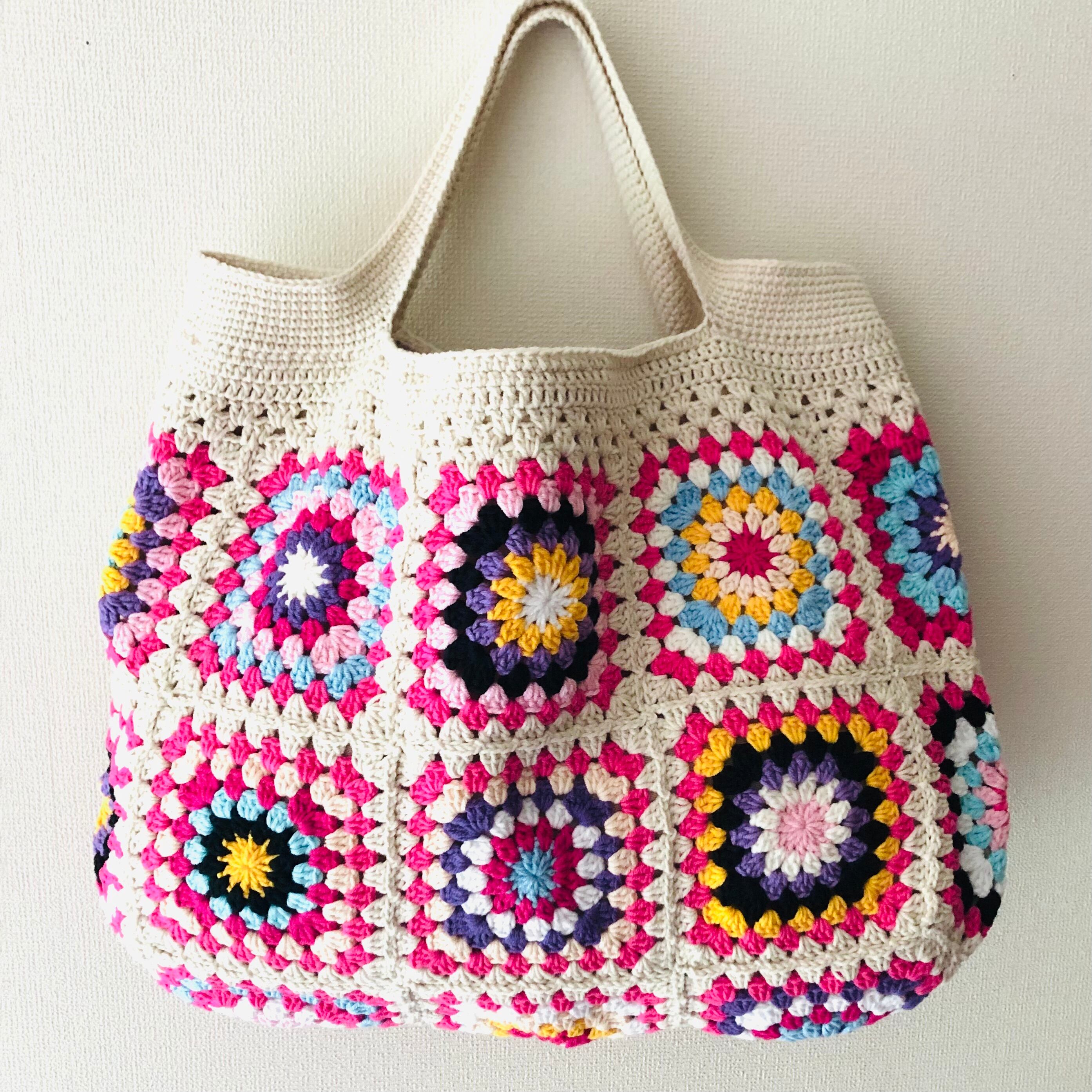 ベージュ×ピンクの色合いが可愛らしいグラニースクエアバッグです。コットン素材で柔らかく持ちやすく、軽いのでお出かけにも便利です。
