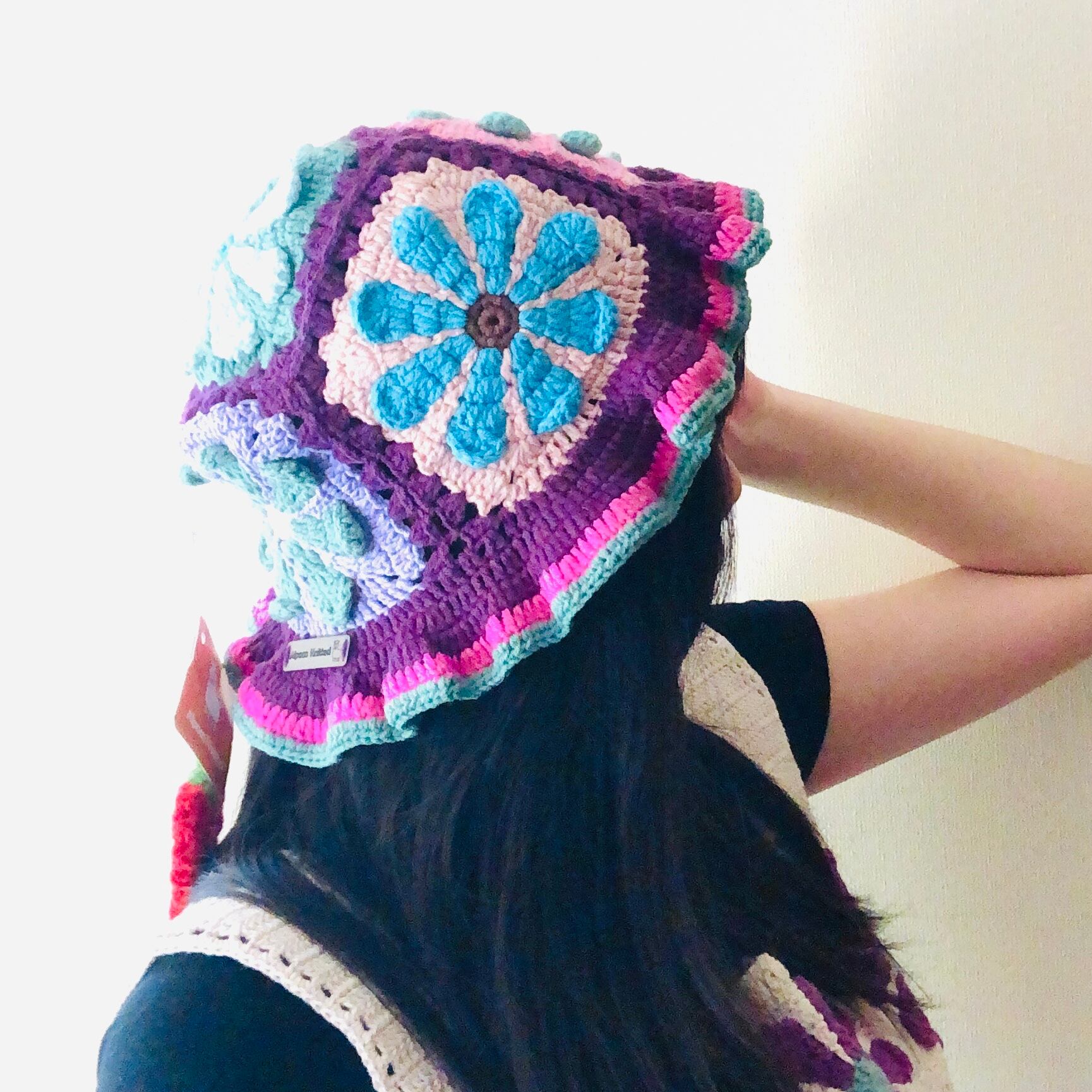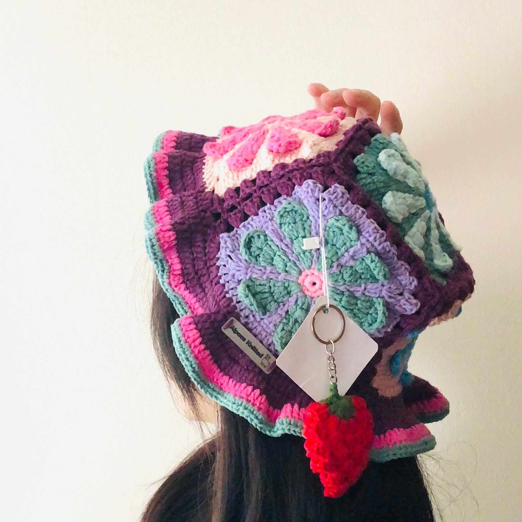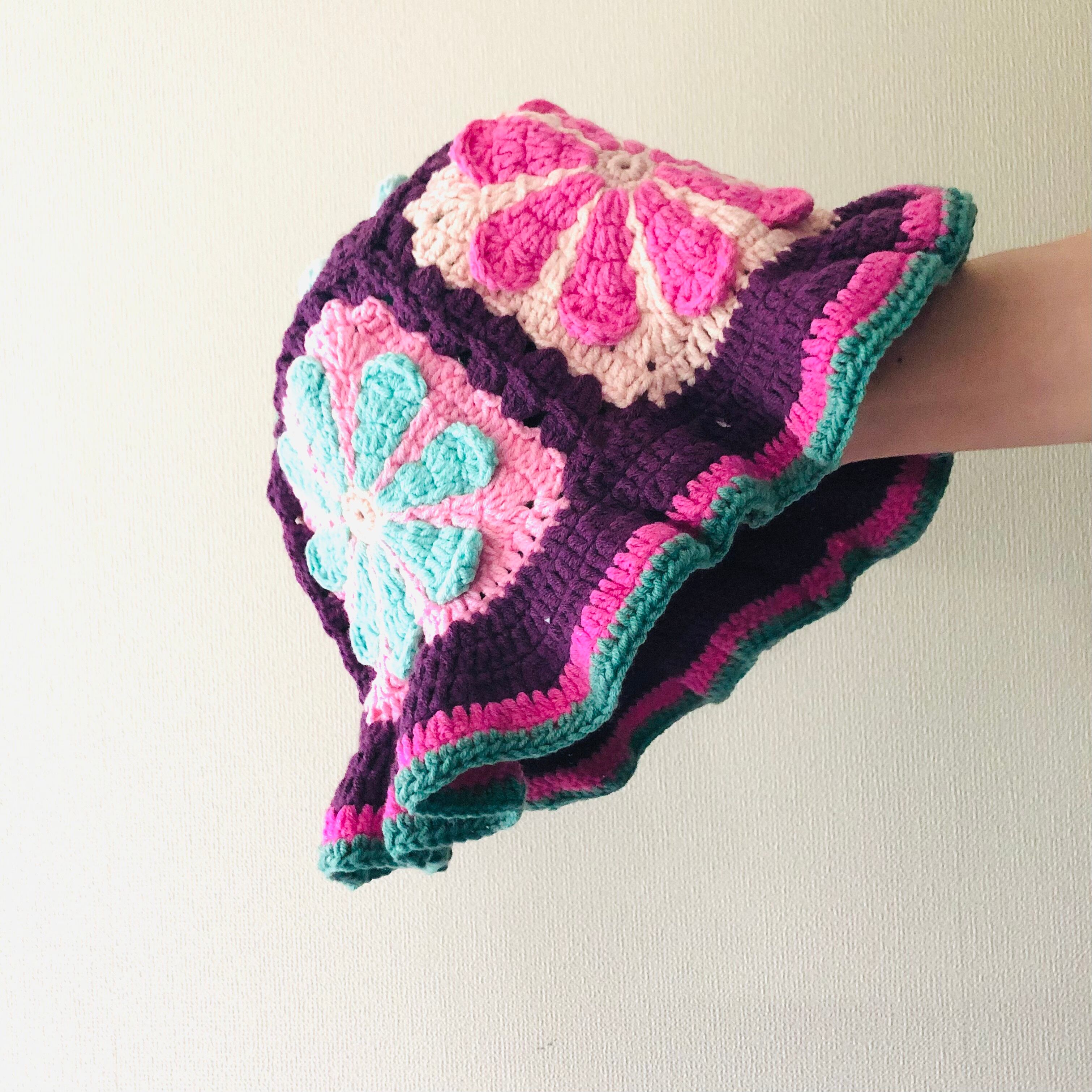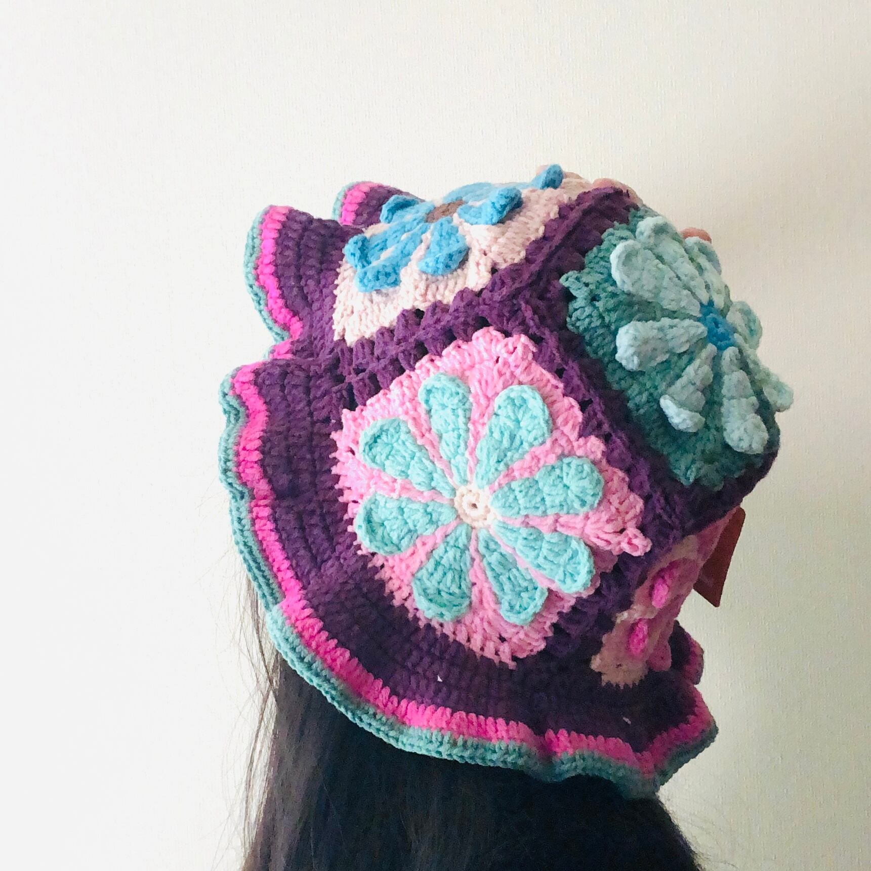 ピンクやミントグリーンのフラワーモチーフに囲まれたカラフルなグラニーハットを被って夏を楽しみませんか?ビーチでのリゾートスタイルにもぴったりです。